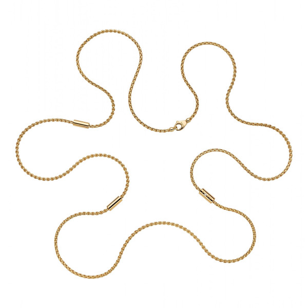 Ref. 89203CX_BB_G_GGG_090 - Aria besteht aus einer neuen zarten, feinmaschigen Goldkette und richtet sich an aufstrebende Luxuskonsumenten, die den Athleisure-Modetrend aufgreifen. Die Stücke der Aria-Kollektion (Ohrringe und Halsketten) wurden so entworfen, dass sie in den drei Goldfarben gemischt und aufeinander abgestimmt werden können, mit goldenen Zylindern, die mit weißen oder schwarzen Diamanten besetzt sind, für Damen und Herren.