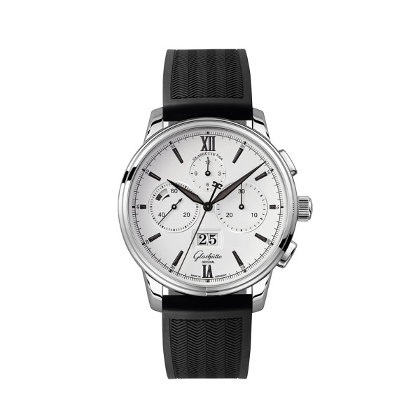 Chronograph mit 12-Stunden-Zähler, 30-Minutenzähler, Stoppsekunde, Flyback, Gangdaueranzeige, kleine Sekunde, Sekundenstopp, Panoramadatum, Stunde und Minute
