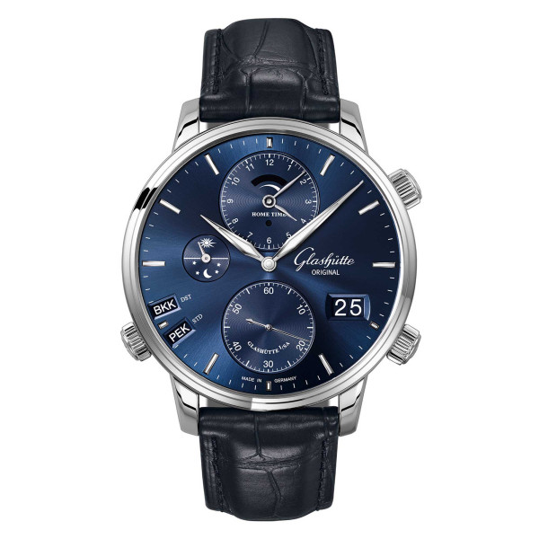 Sommer-/Standardzeit, Panoramadatum, kleine Sekunde, Sekundenstopp, Tag-/Nacht-Indikator (Heimatzeit), Tag/Nacht-Anzeige Ortszeit, Gangreserveanzeige